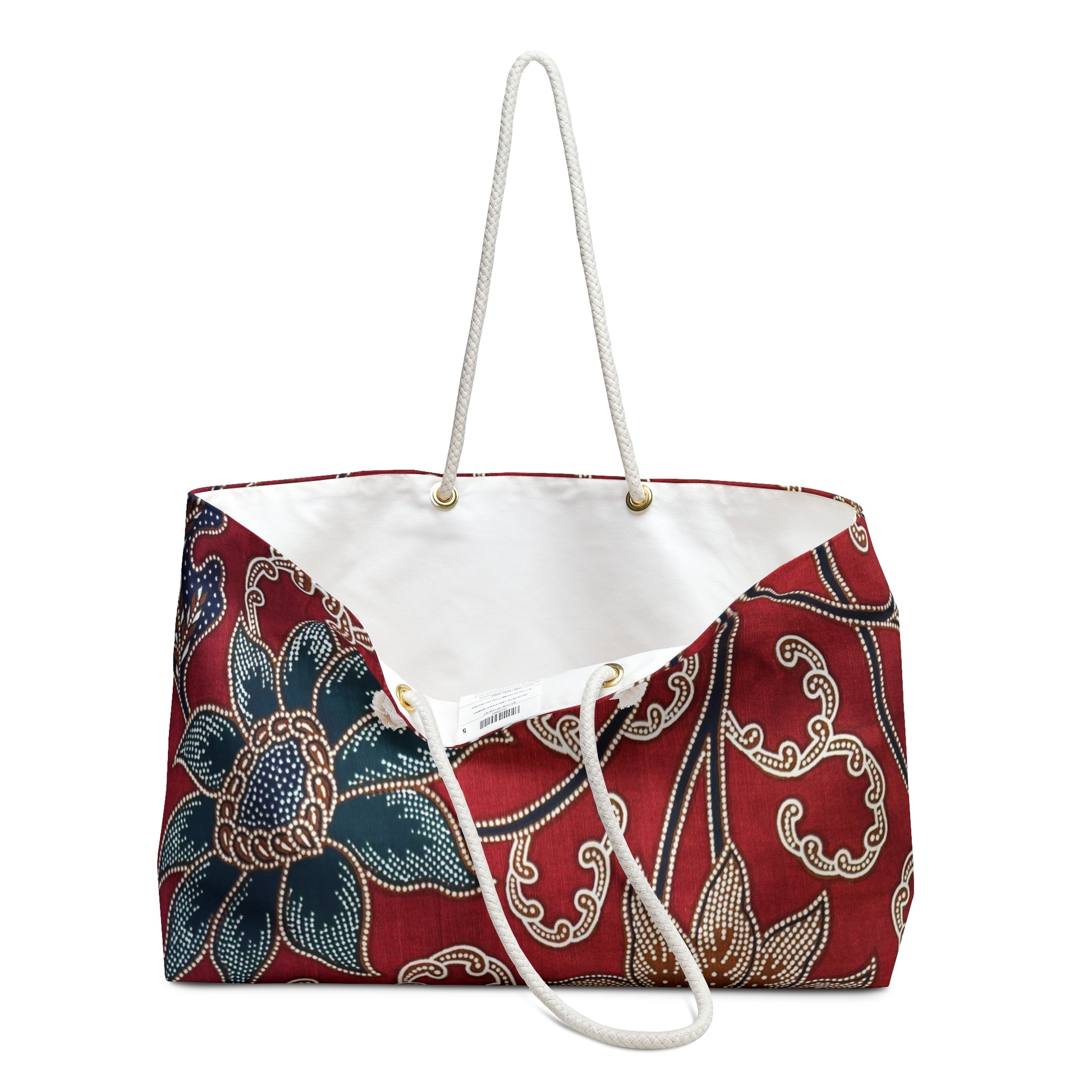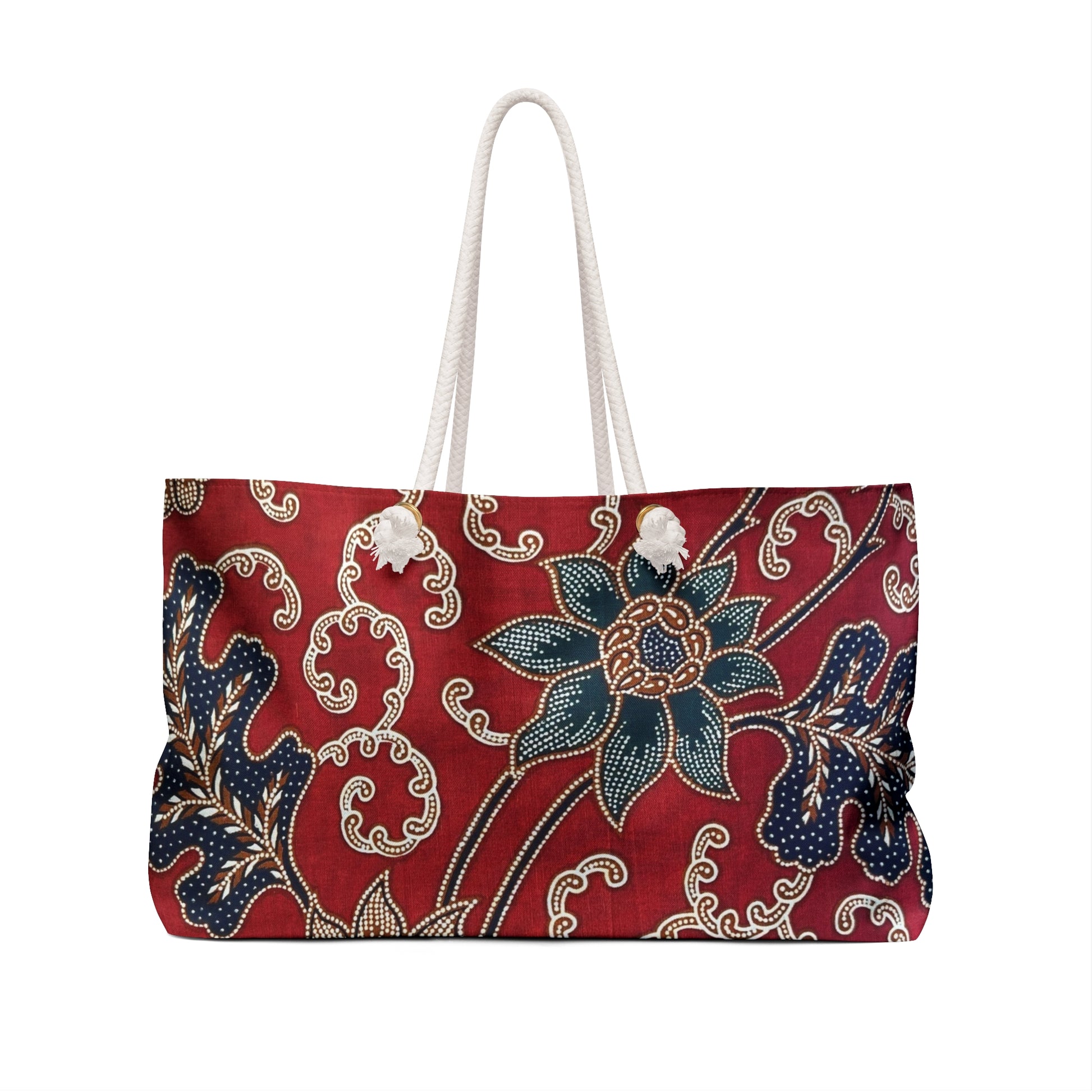 Our oversized Weekender Tote is perfect for your weekend at the beach or in town. The wide-mouthed, durable bag holds a generous amount of personal items and is easily held by its thick rope handles. Size: 24" x 13". 100% Spun Polyester. Note: This is PRINTED Batik.