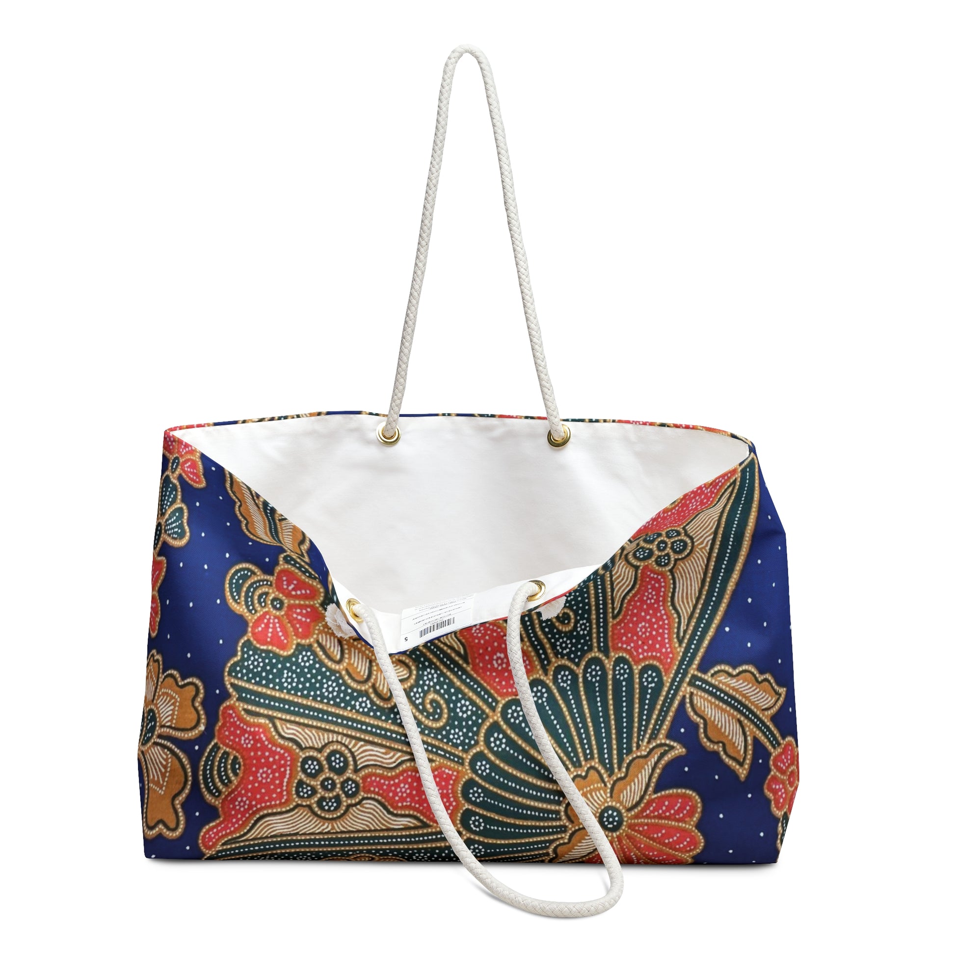 Our oversized Weekender Tote is perfect for your weekend at the beach or in town. The wide-mouthed, durable bag holds a generous amount of personal items and is easily held by its thick rope handles. Size: 24" x 13". 100% Spun Polyester. Note: This is PRINTED Batik.